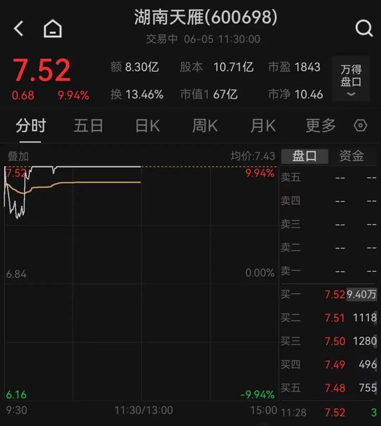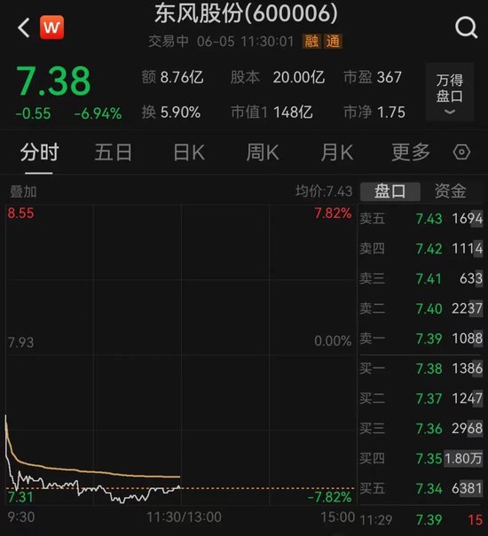A股方面,东风股份(600006)盘中一度跌近8%,截至午间收盘跌6.94%。
