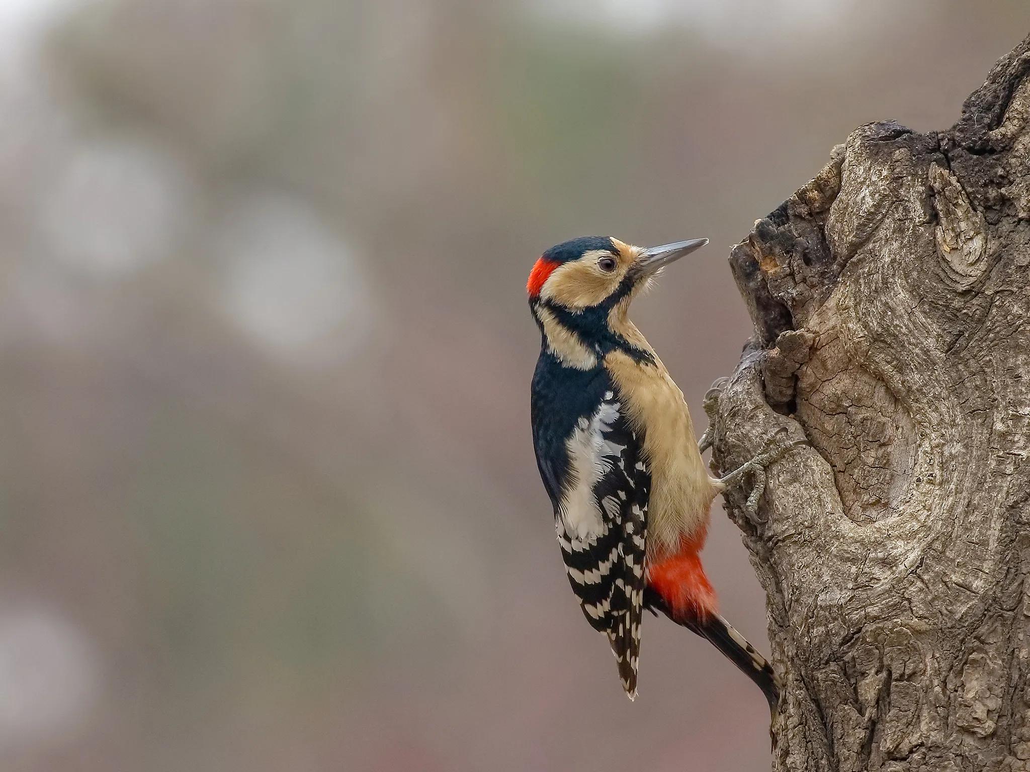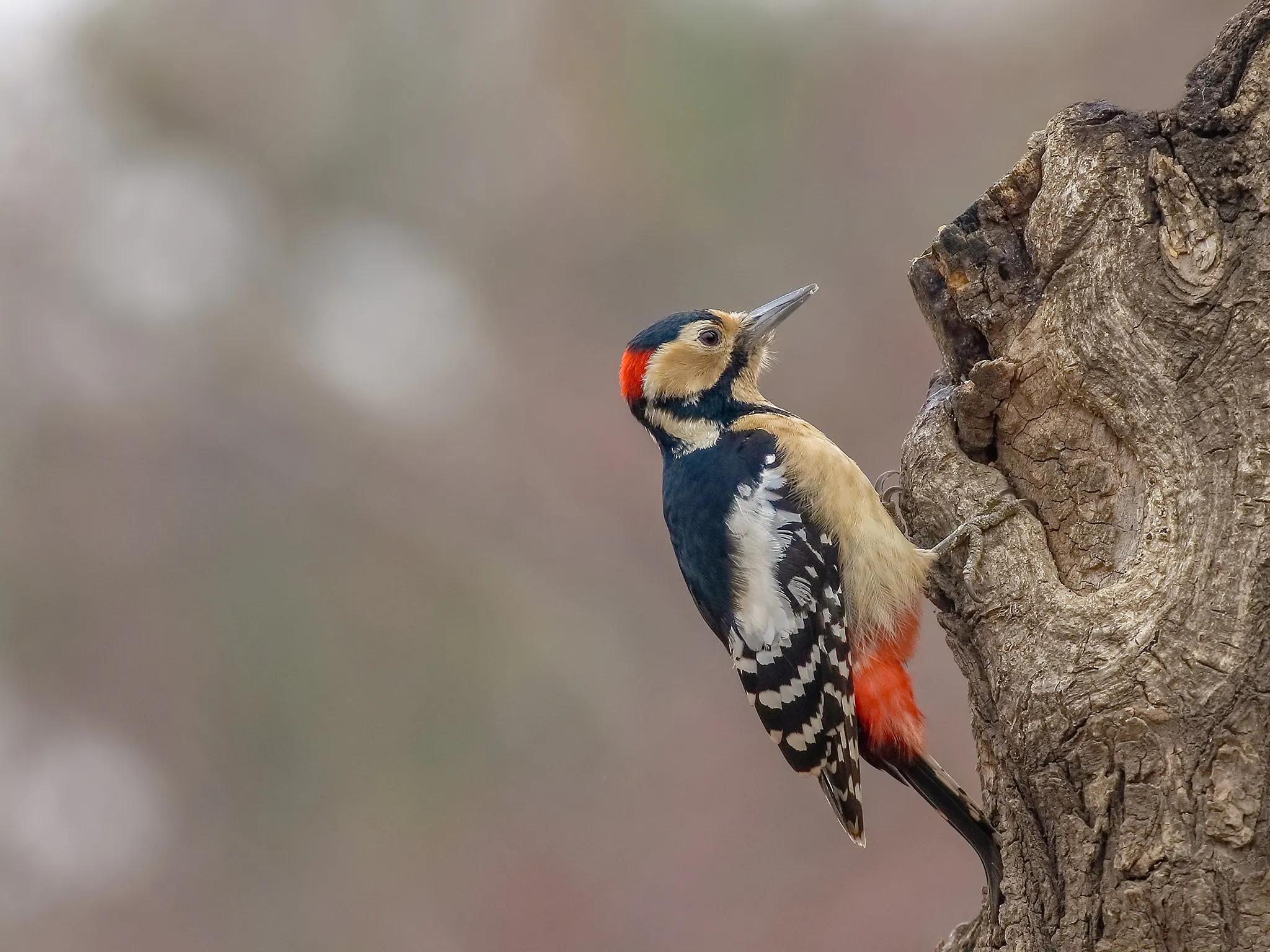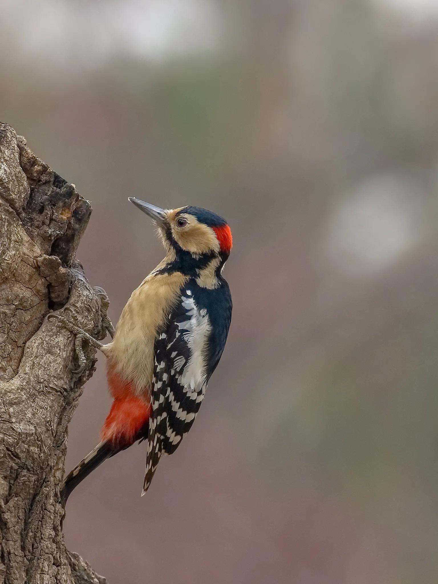 背部、翅膀以及尾羽为黑色,但翅膀上有着一块爱白色的羽斑,飞羽上也有着一排排的白色斑点。它们的臀部为红色的羽毛,如同穿着一条红色的裤衩子。看起来有点滑稽。雌鸟与雄鸟相似,但雌鸟的脑后并没有红色的羽毛。但不论雌鸟还是雄鸟到是十分漂亮的,还都是森林里是小小医生。