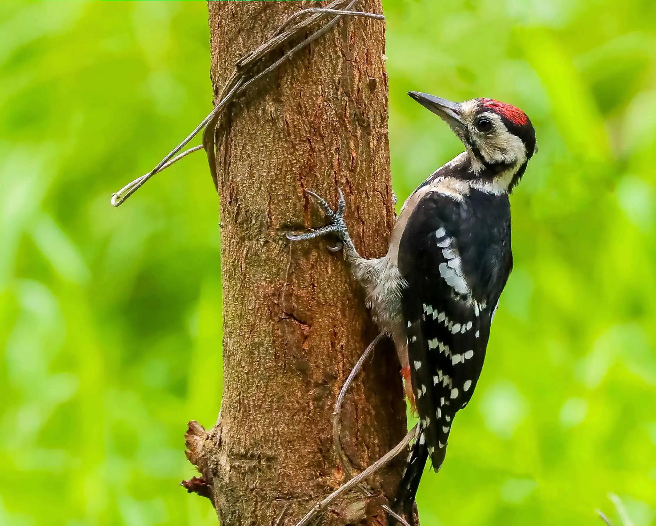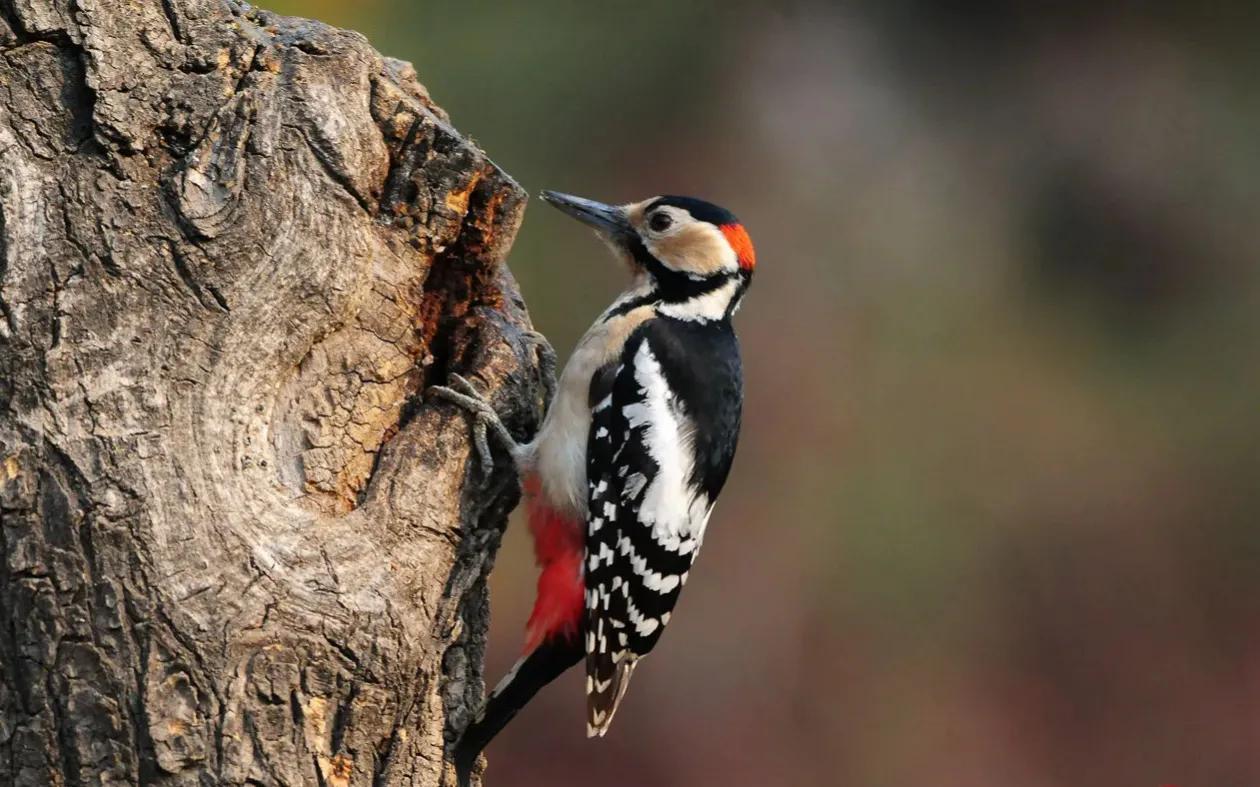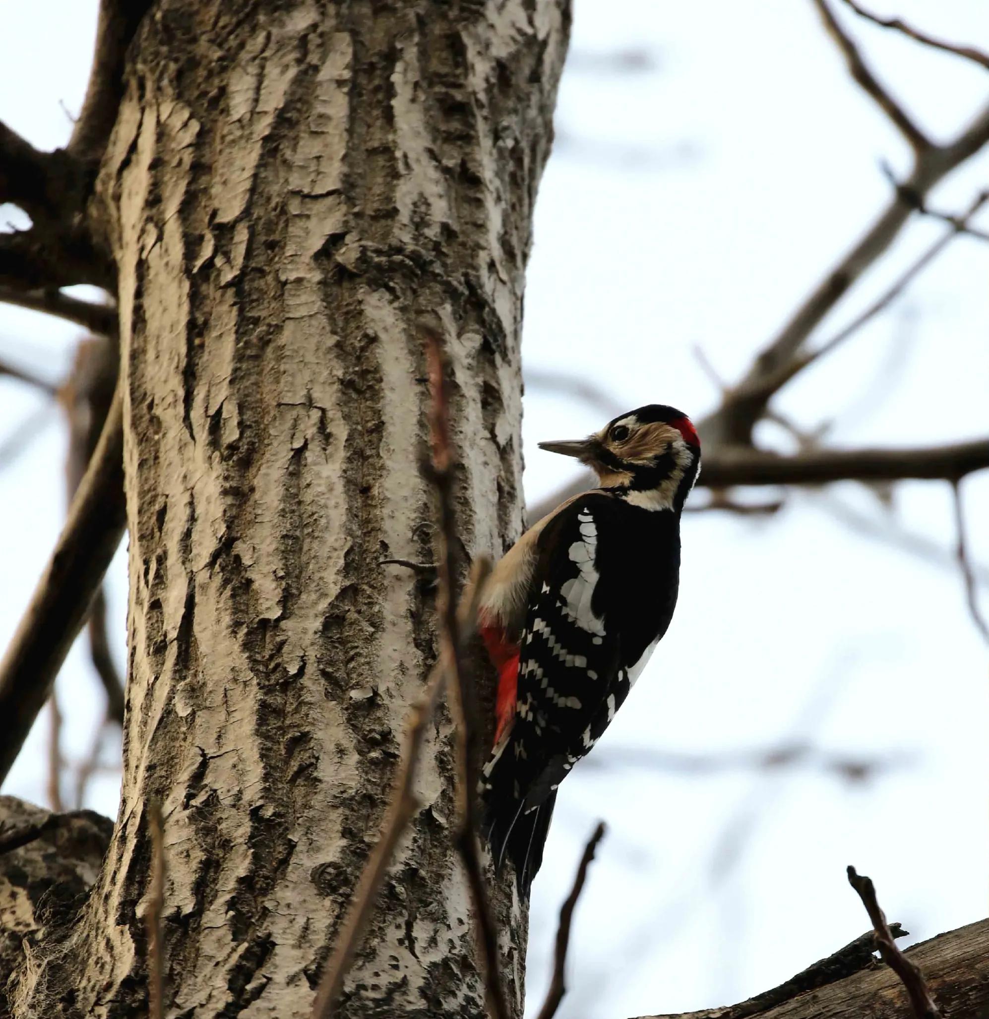 大斑啄木鸟:鴷形目、啄木鸟科、啄木鸟属鸟,属小型鸟类。体长20-25厘米,体重62-79克。它们拥有黑色的鸟喙,鸟喙直而坚韧,爪子为黑褐色蔚莱策略,十分的有力,能牢牢的抓住树干。眼睛虹膜为棕色,瞳孔为黑色。前额、脸部、喉部、后颈、腹部为白色,头顶为黑色,脑后有一小撮红色,红色后面有一条黑色的羽带,由红色的后脑延伸到胸前,并交汇在一起,嘴角处也有一条黑色的羽带,跟脑后那条交汇在一起。