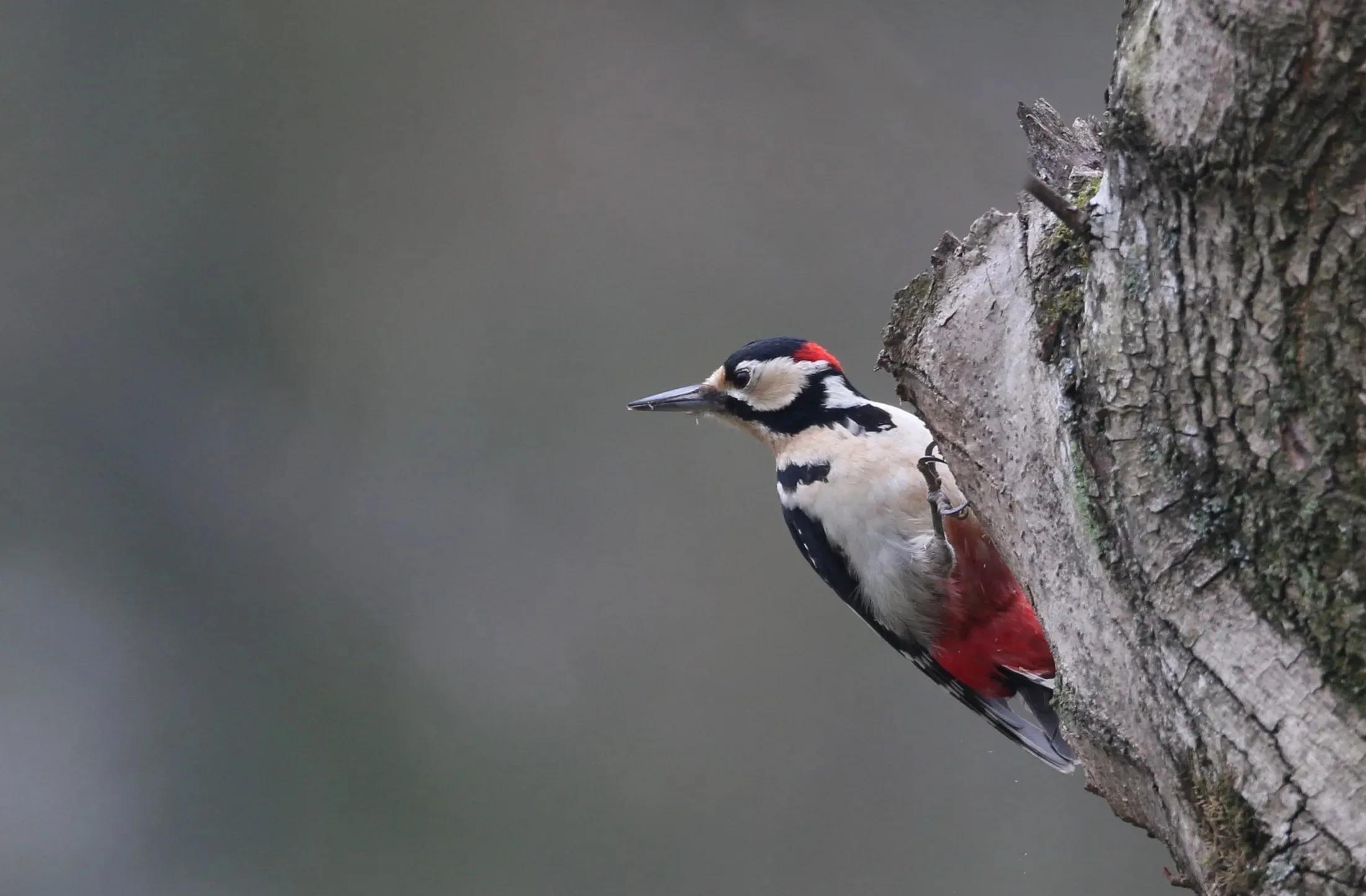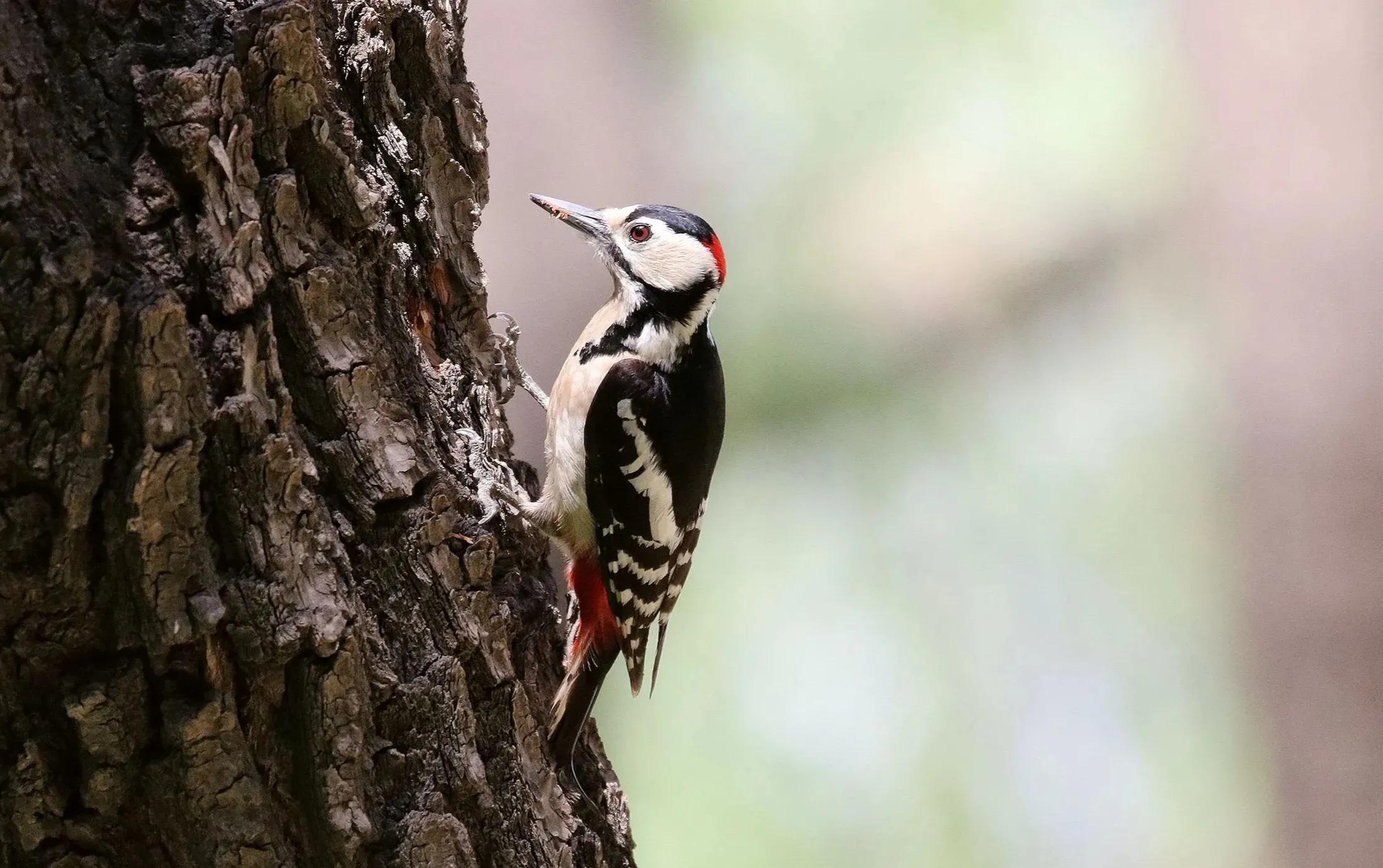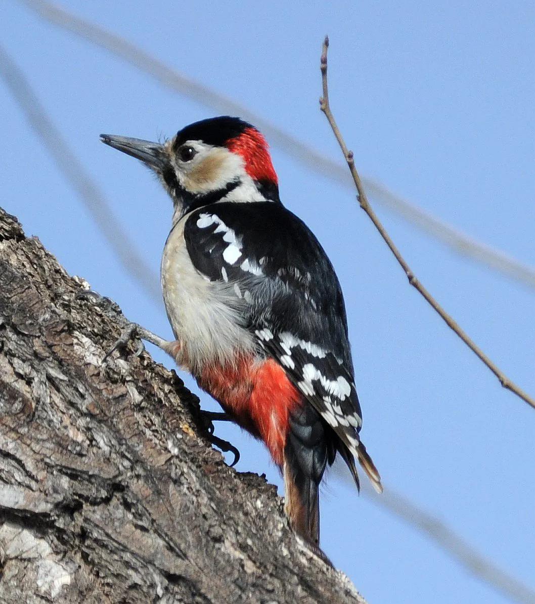 大斑啄木鸟:鴷形目、啄木鸟科、啄木鸟属鸟,属小型鸟类。体长20-25厘米,体重62-79克。它们拥有黑色的鸟喙,鸟喙直而坚韧,爪子为黑褐色蔚莱策略,十分的有力,能牢牢的抓住树干。眼睛虹膜为棕色,瞳孔为黑色。前额、脸部、喉部、后颈、腹部为白色,头顶为黑色,脑后有一小撮红色,红色后面有一条黑色的羽带,由红色的后脑延伸到胸前,并交汇在一起,嘴角处也有一条黑色的羽带,跟脑后那条交汇在一起。