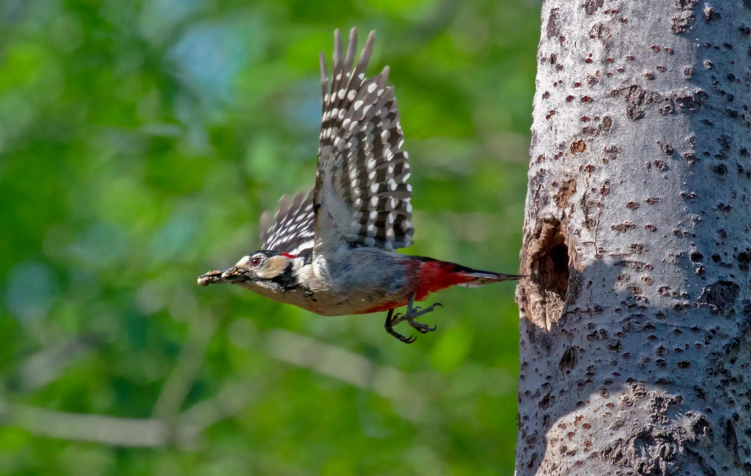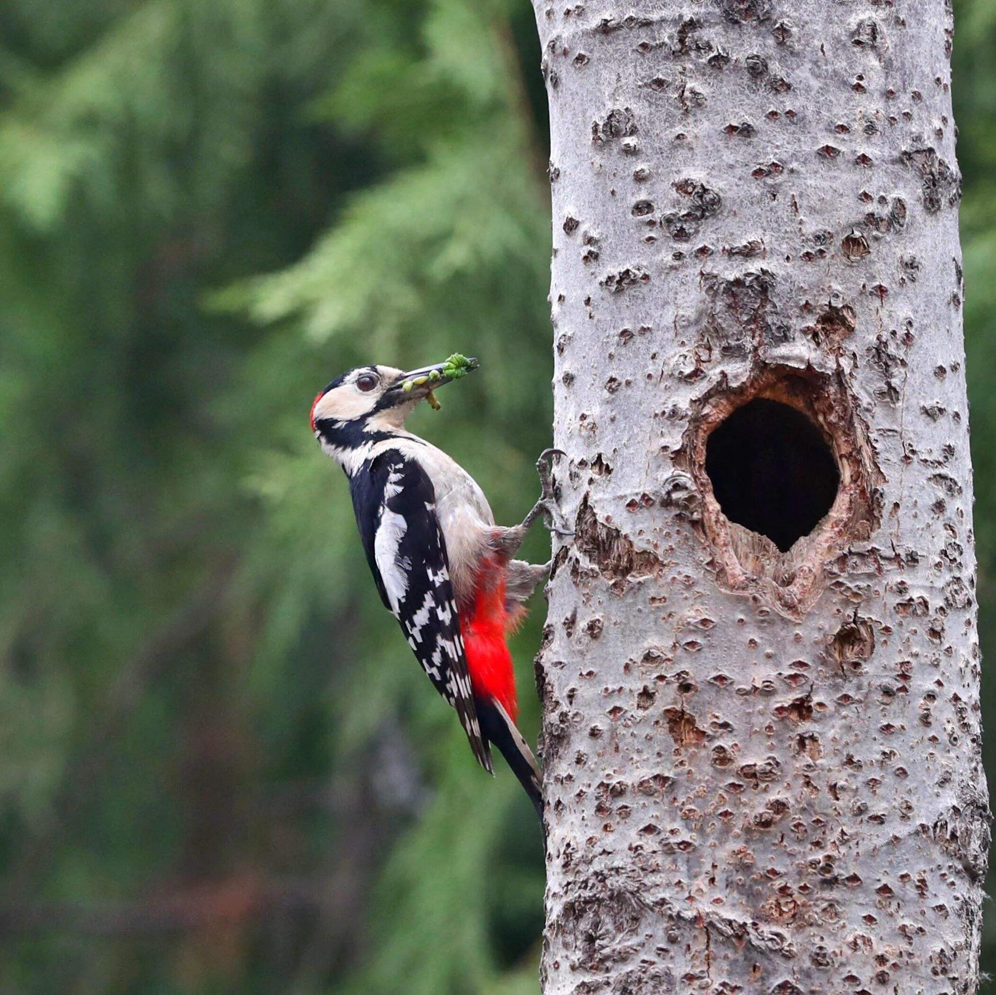 大斑啄木鸟繁殖期为每年的4-5月,于三月末就开始进行求偶活动,期间它们会用自己的鸟喙猛烈的敲击树干,发出连续的撞击声,以此来吸引异性。有时也会出现两只雄鸟争夺一只雌鸟的情况,雄鸟间会彼此争斗,直到其中一只被赶走为止。鸟巢多建在树洞里,啄洞时多选择在树心已经腐朽的阔叶树树干或者是较粗的侧枝上,树洞离地2-10米。